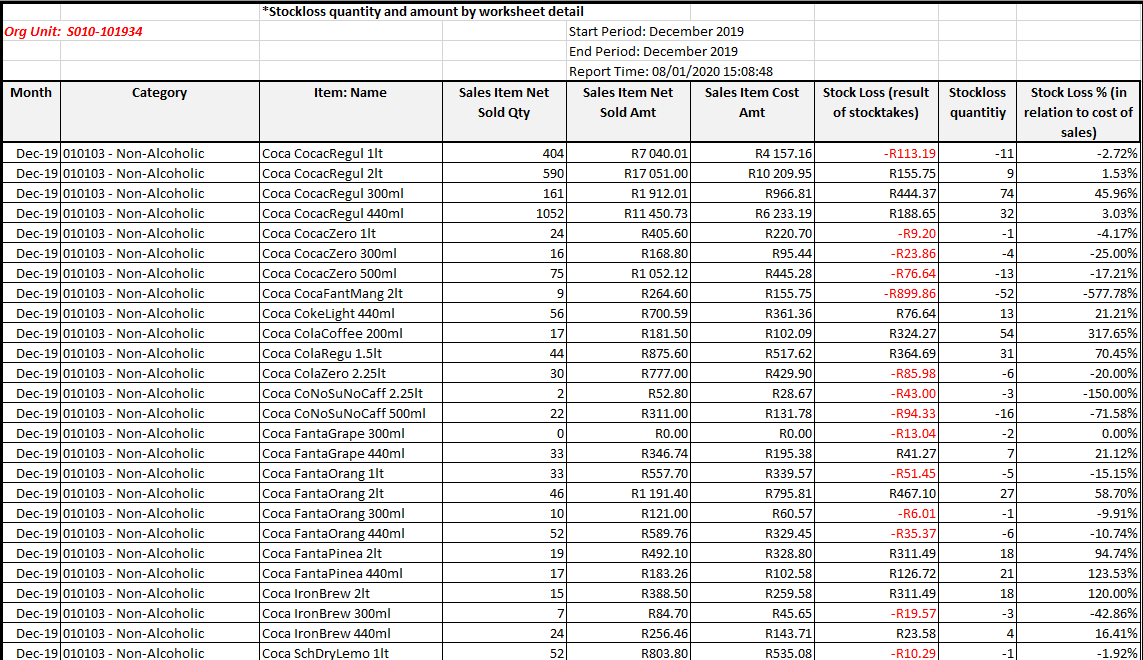 The spreadsheet must be in a specific format for the transaction. The example shown here is the Stock Loss report extracted from the Point-of-sales system.